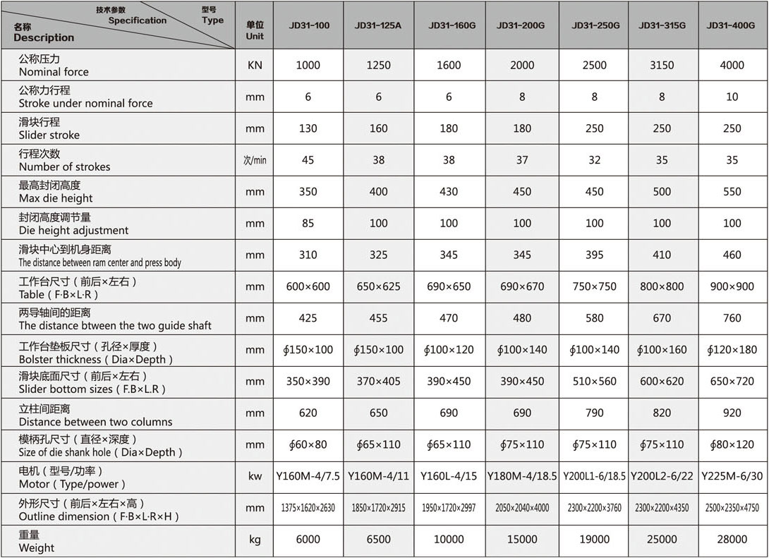 J31系列閉式熱鍛造壓力機,應用性較廣,是鍛造、切邊、 沖孔、粗鍛、汽車部件、標準件、螺帽、異型鍛件的專用設備,也可以進行沖裁、拉伸、彎曲各種零部件等工藝, 是目前國內鍛造行業的理想機型。